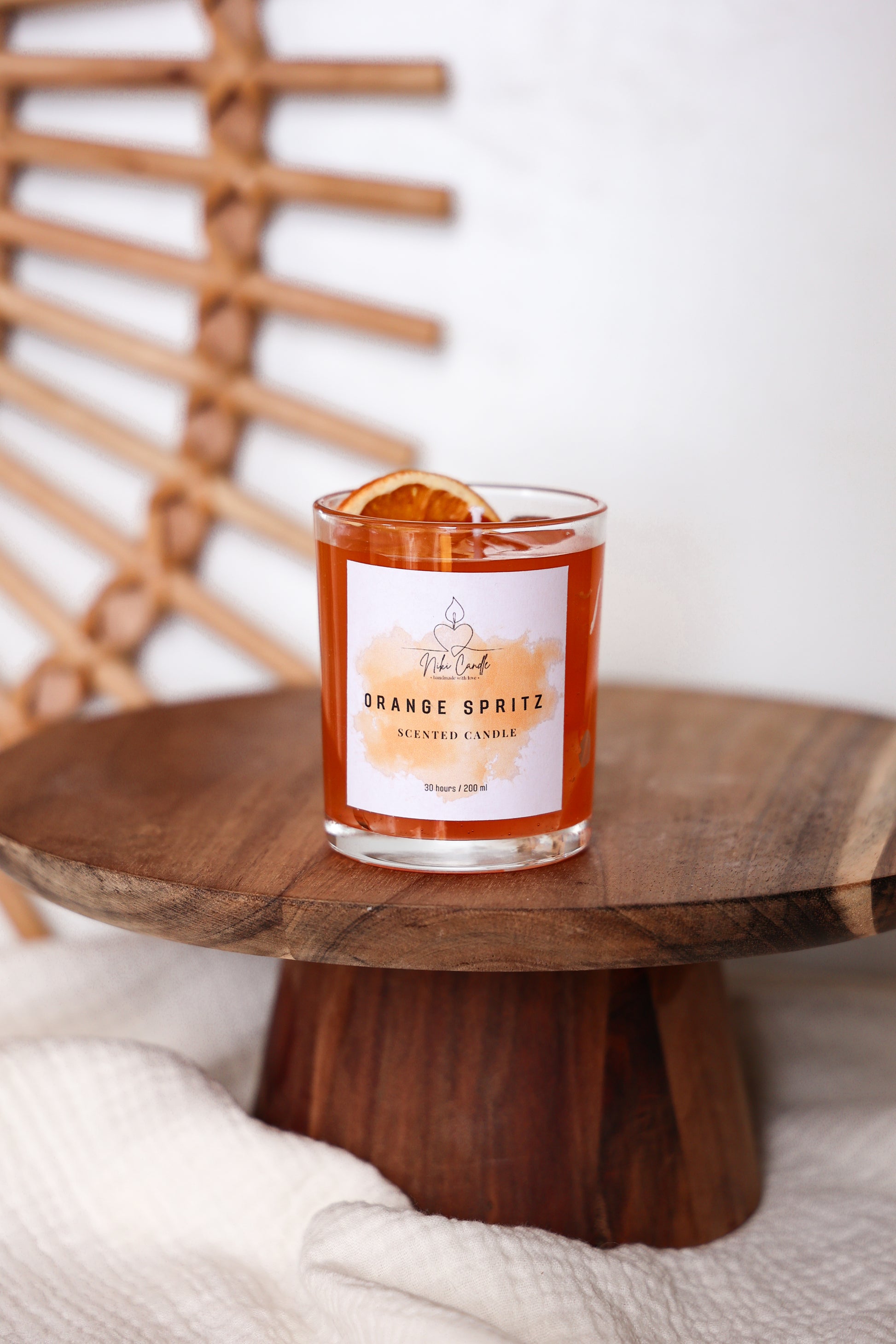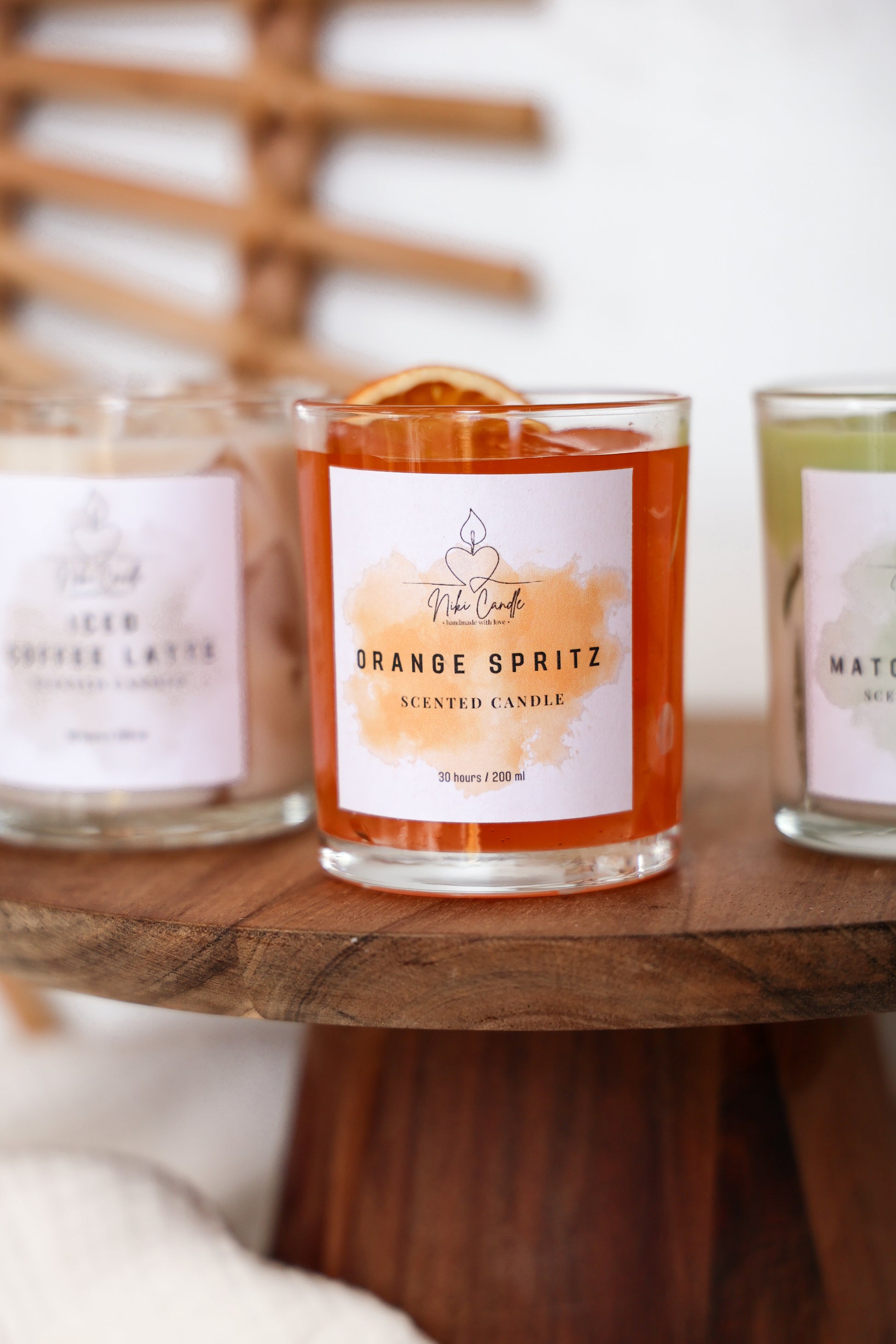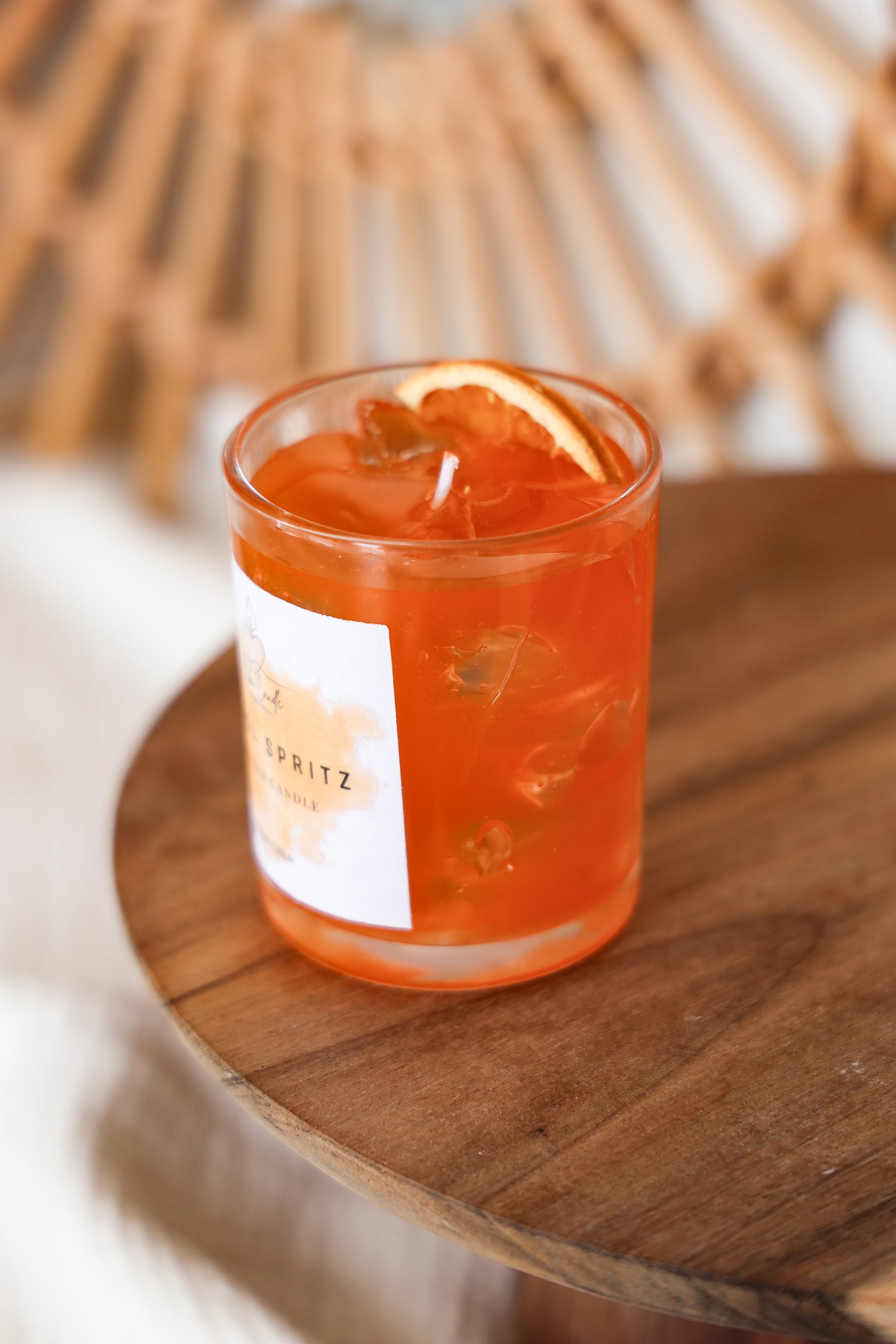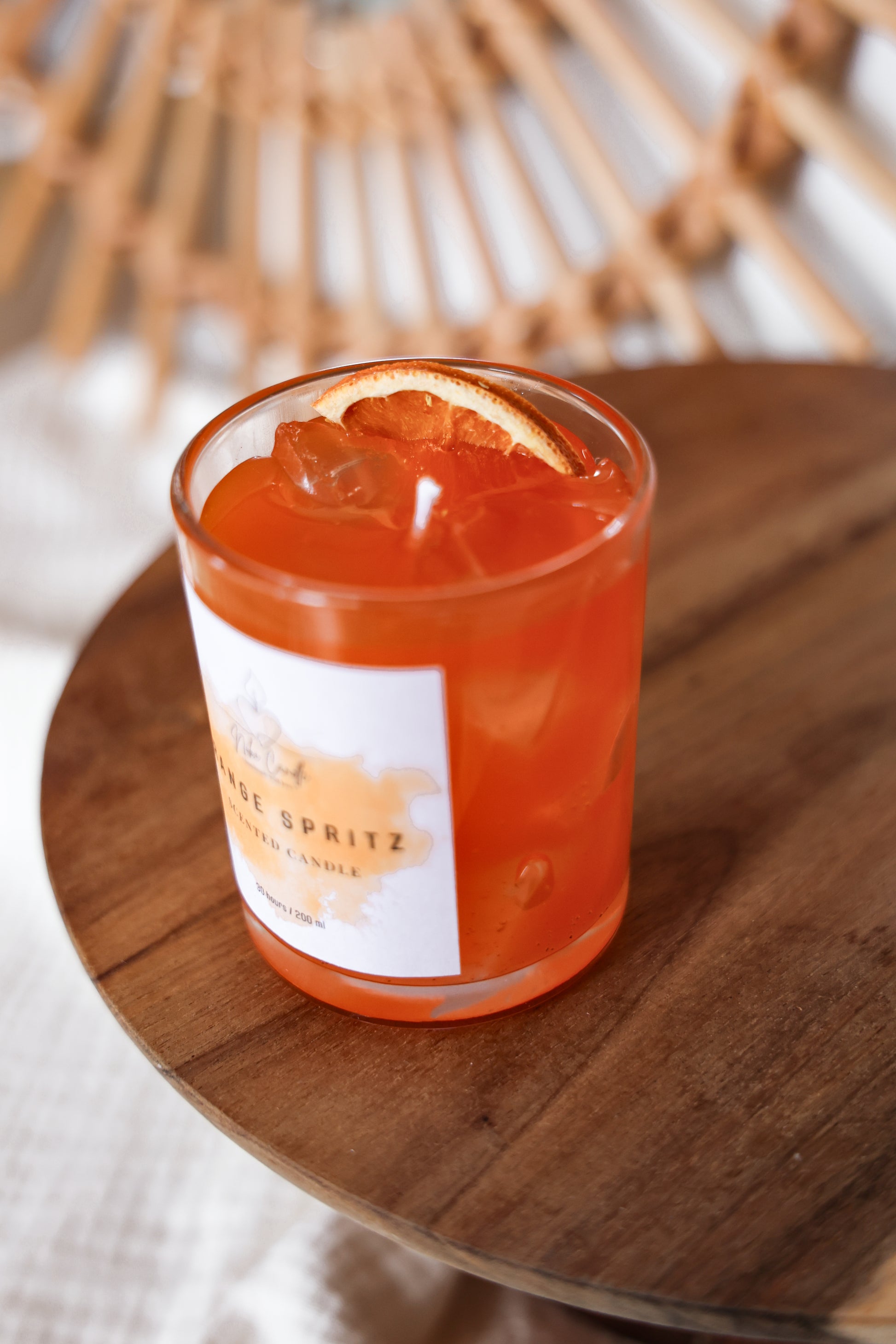 Holy Aperoli! Unsere Kerze aus orangem Gelwachs duftet herrlich leicht nach frischer Orange. Mit täuschenden echten Eiswürfeln und einer getrockneten Orangenscheibe für den perfekten Sommer-Look.