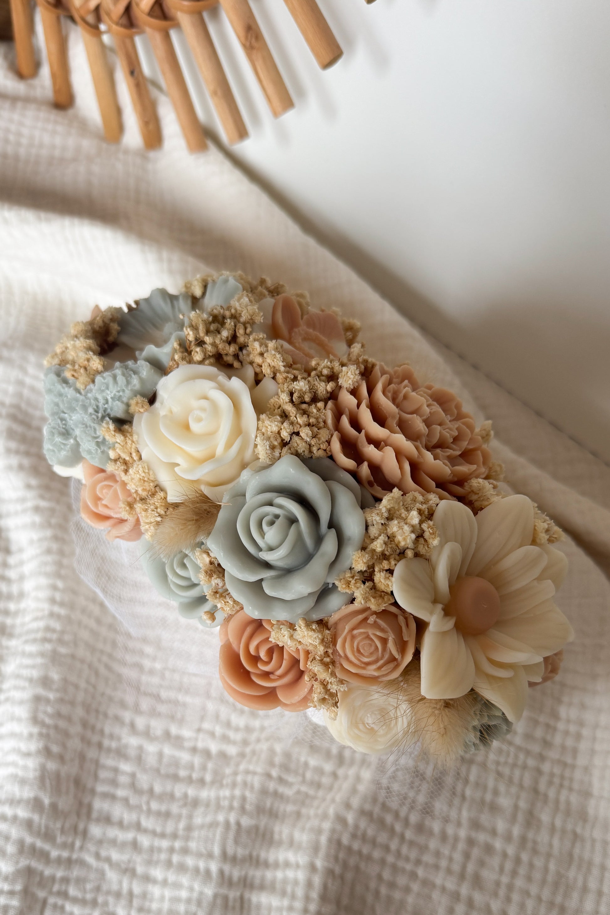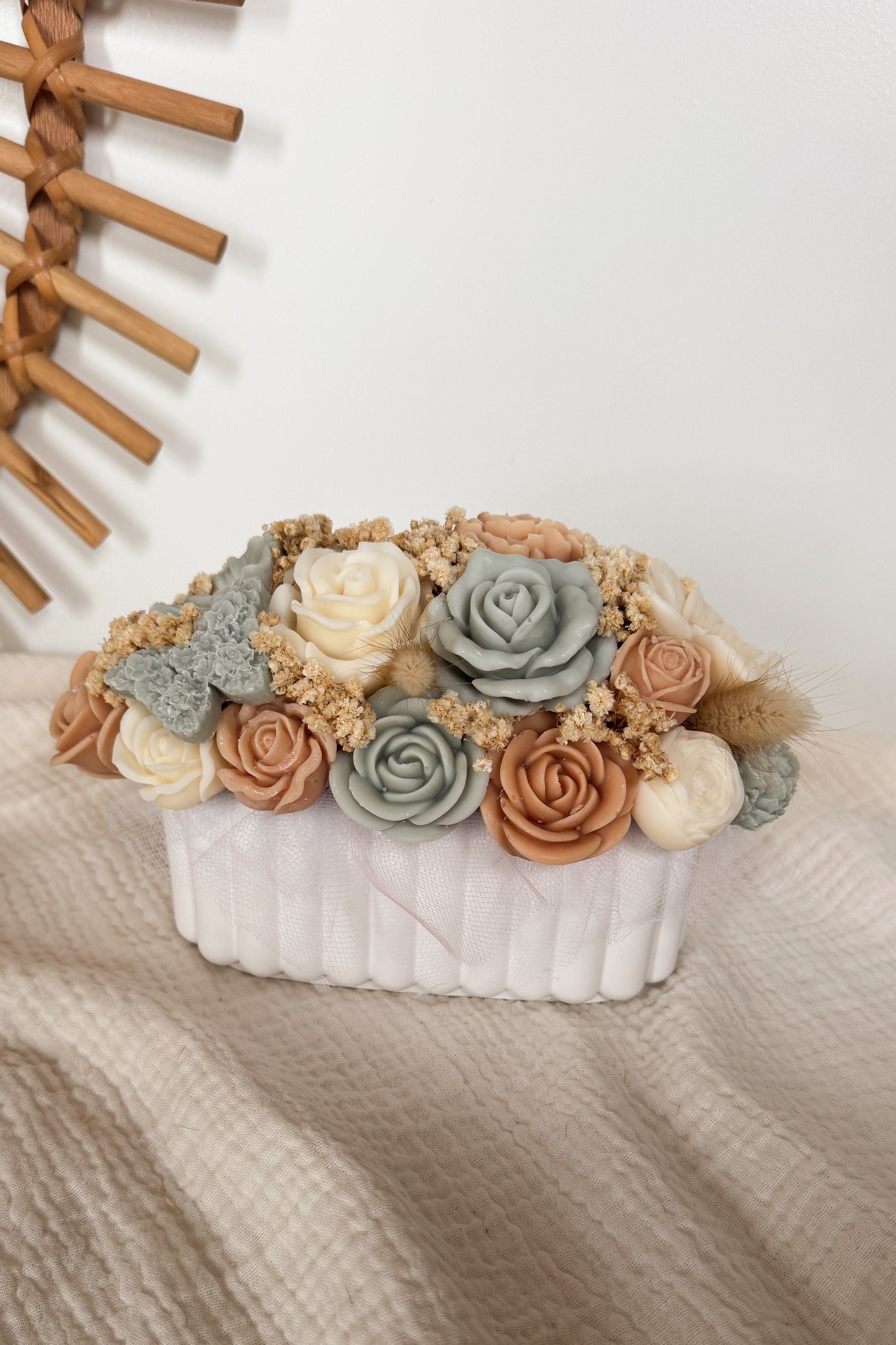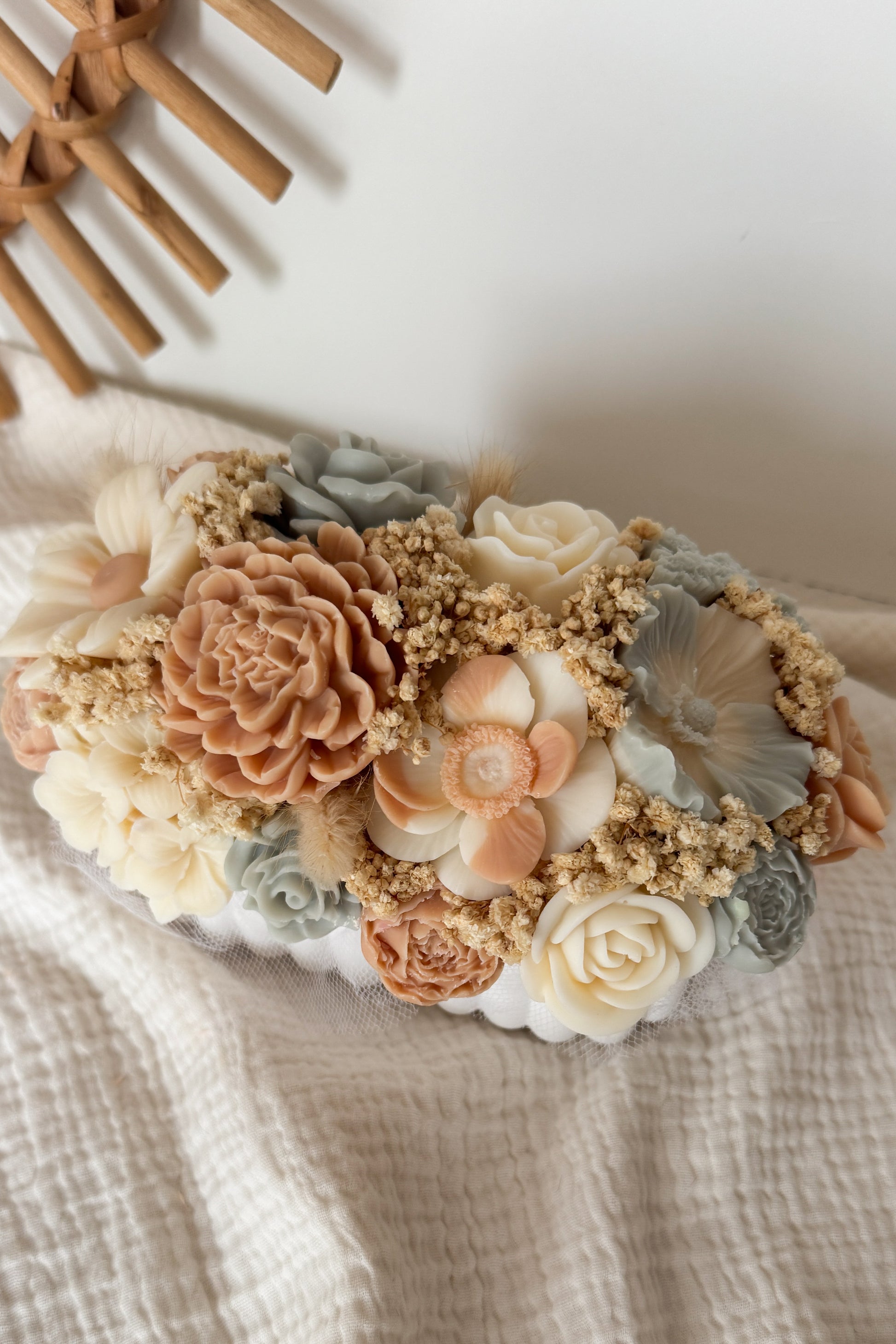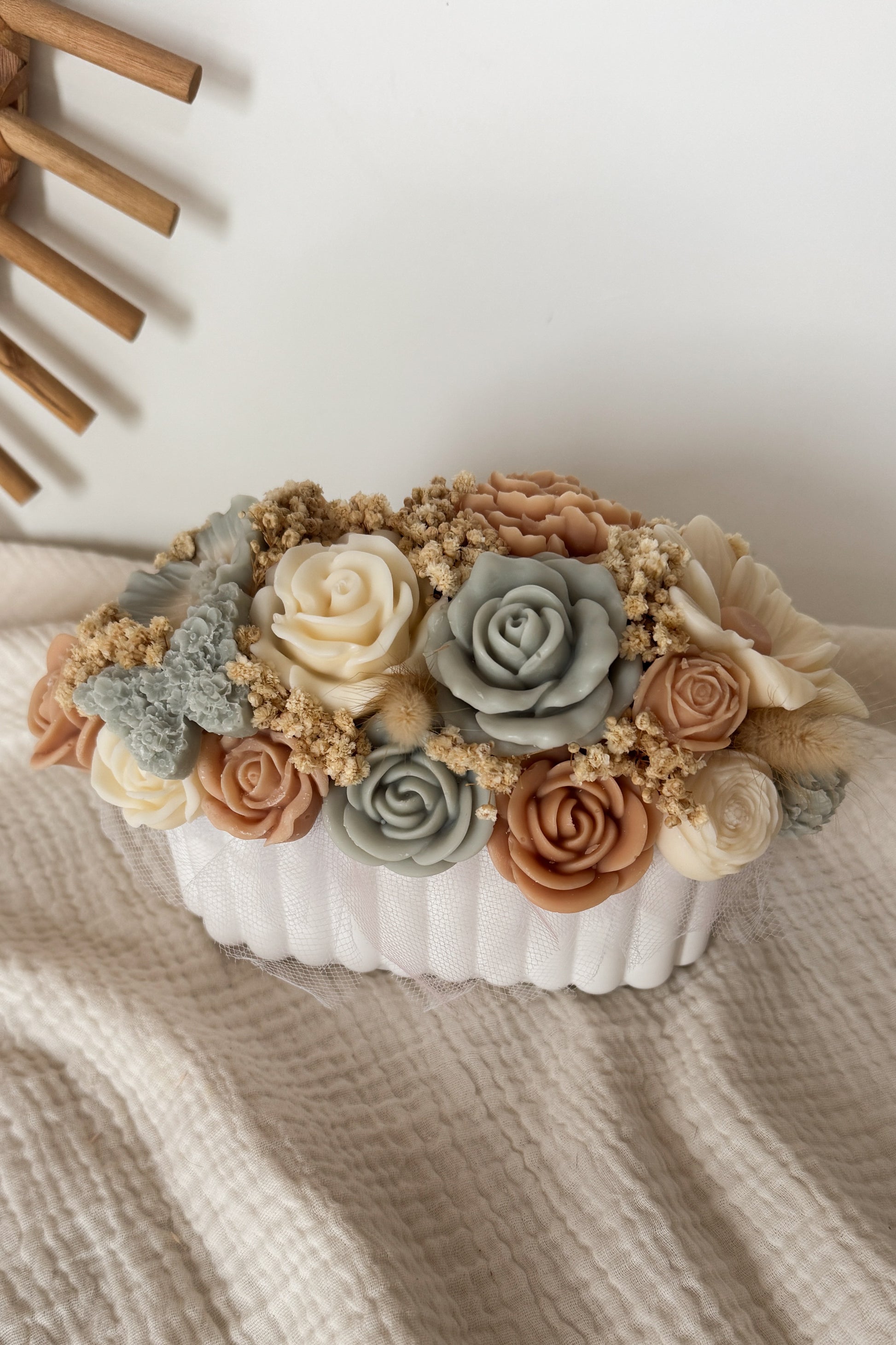 Handgemachter Blumenstrauß aus kleinen Wachsblüten aus Rapswachs. In einer handgemachten ovalen Form aus Keramik gesteckt.