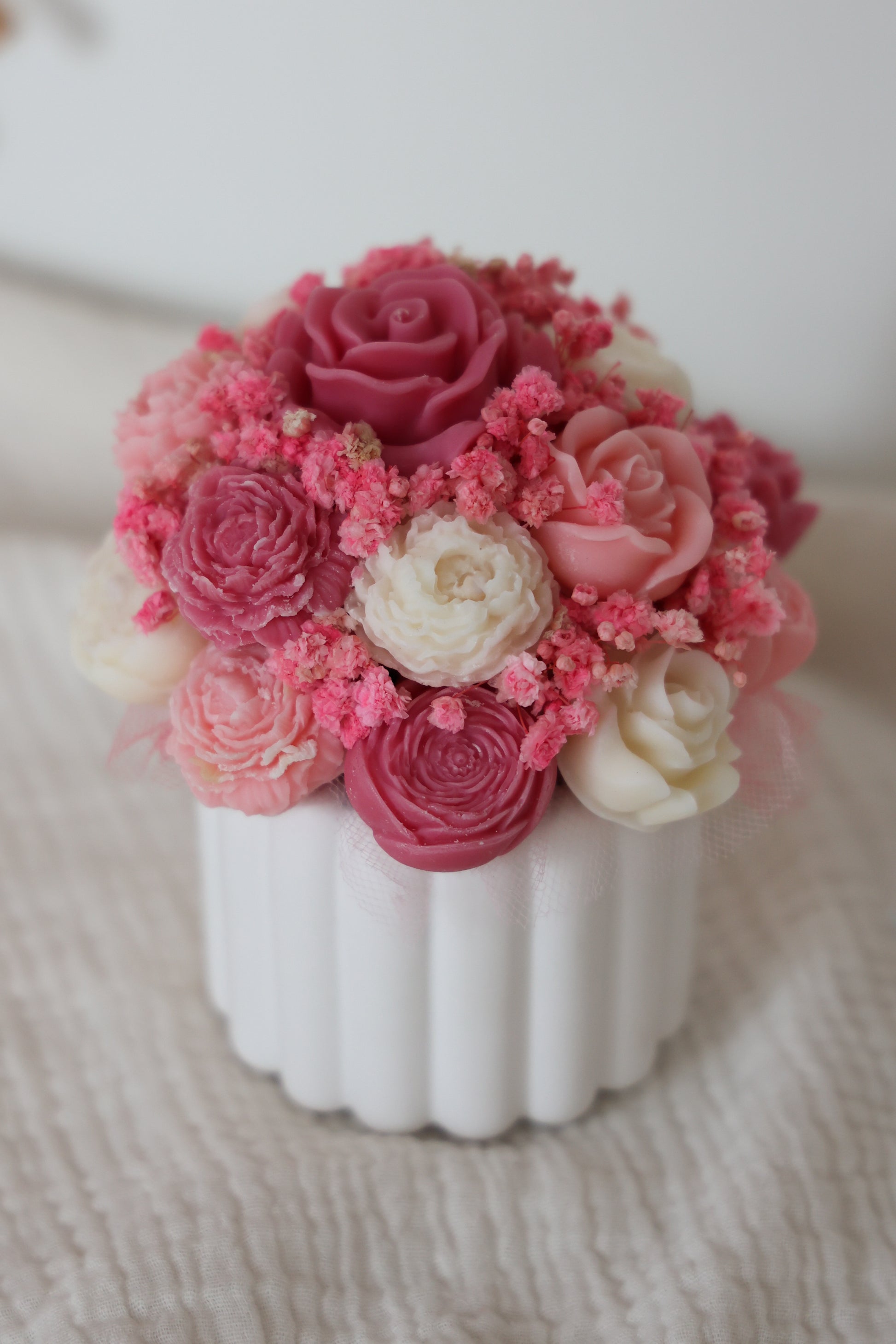 Handgemachter Blumenstrauß aus kleinen Wachsblüten aus Rapswachs. In einer handgemachten Form aus Keramik gesteckt.