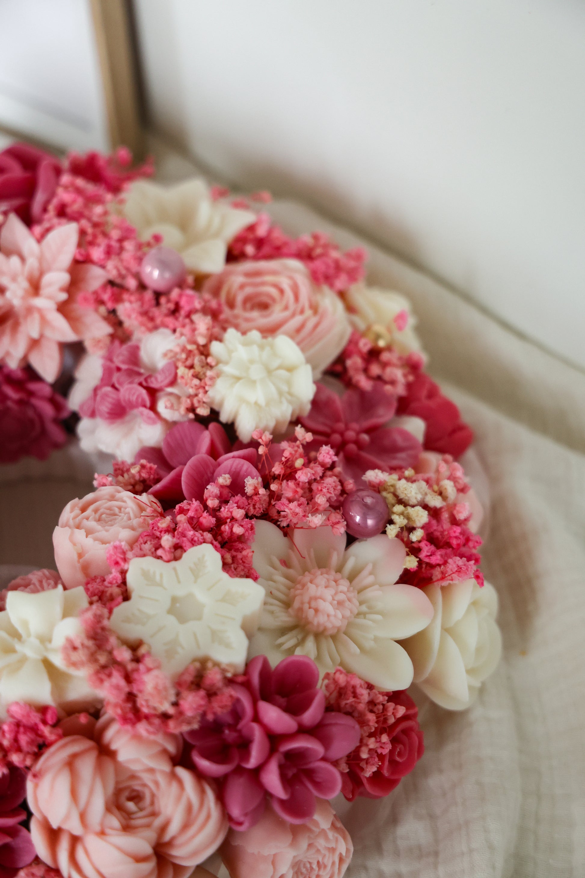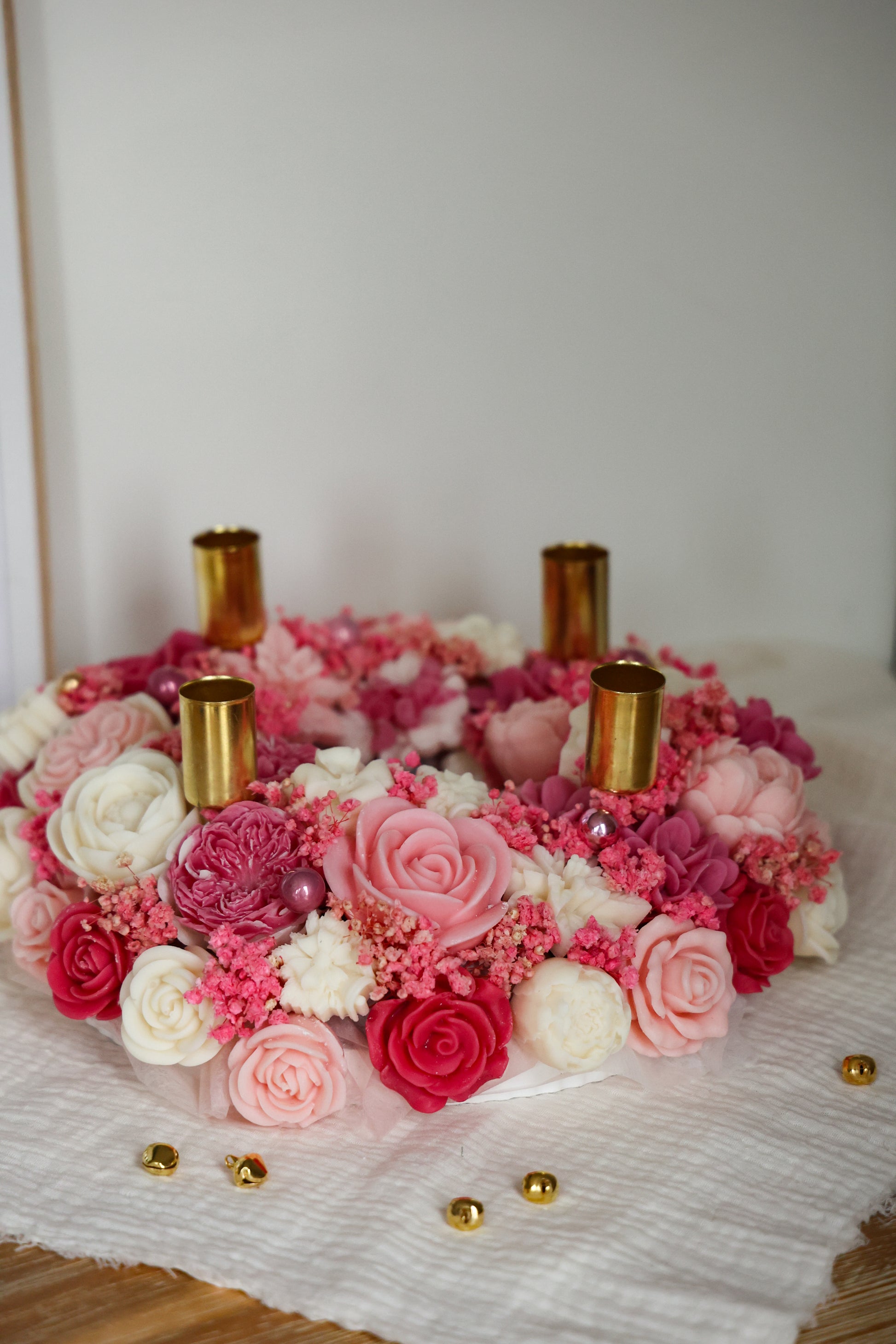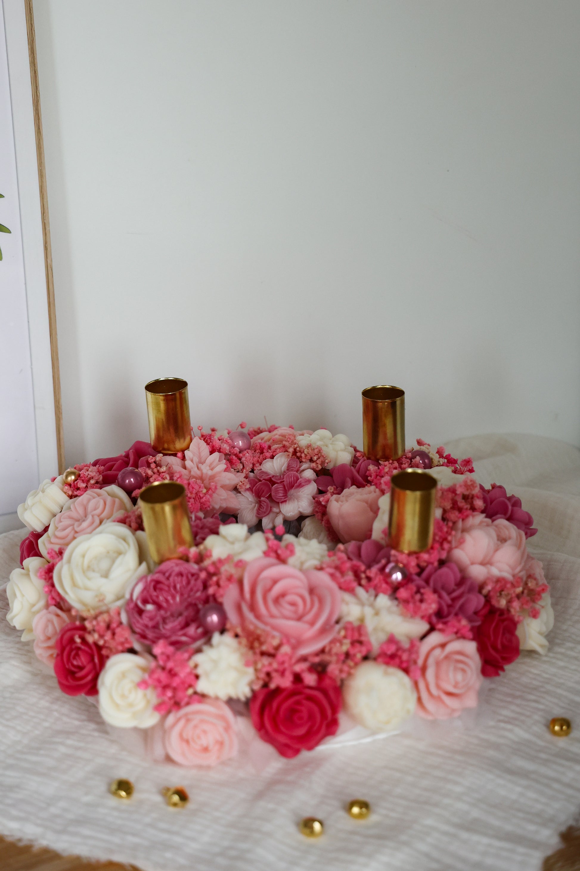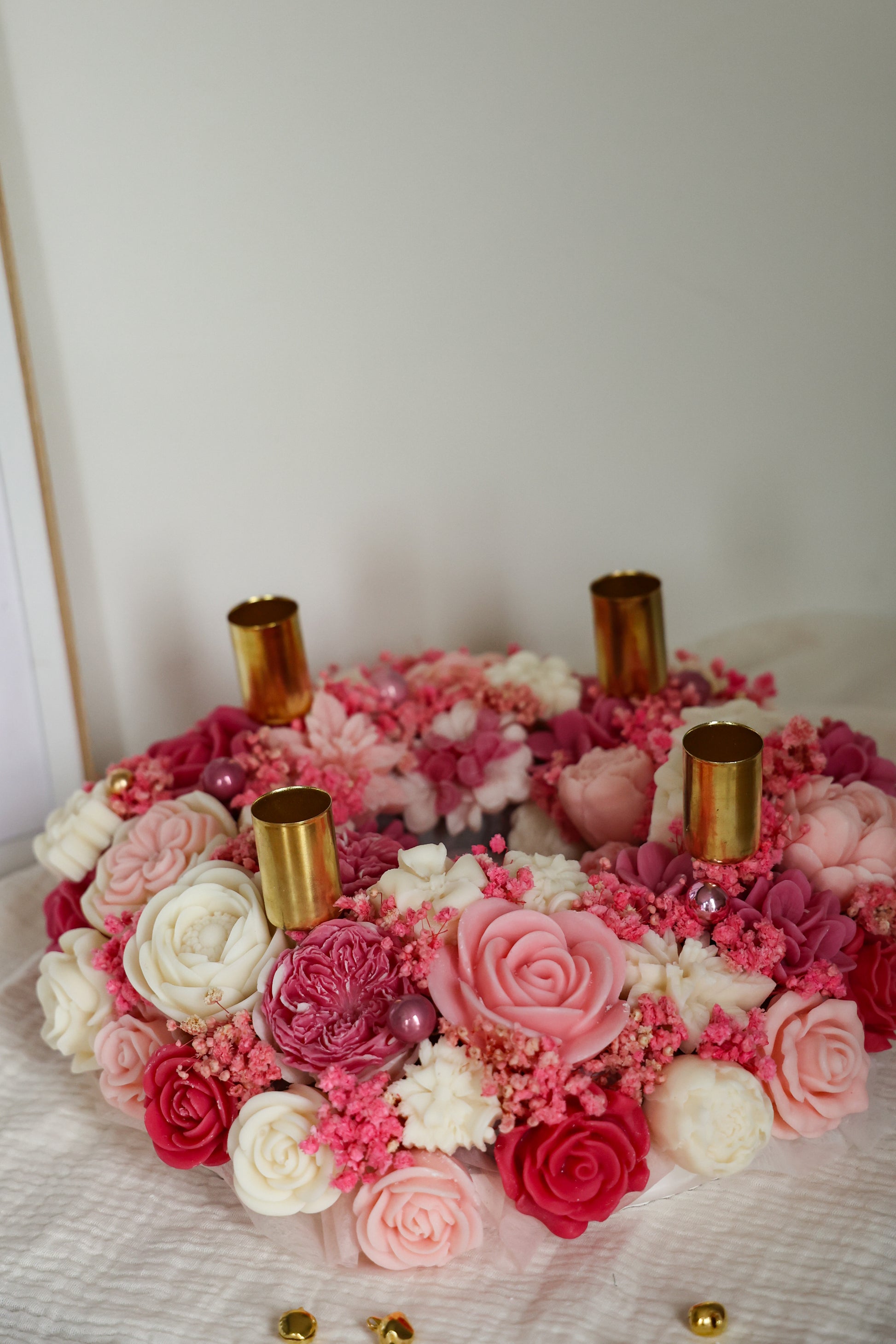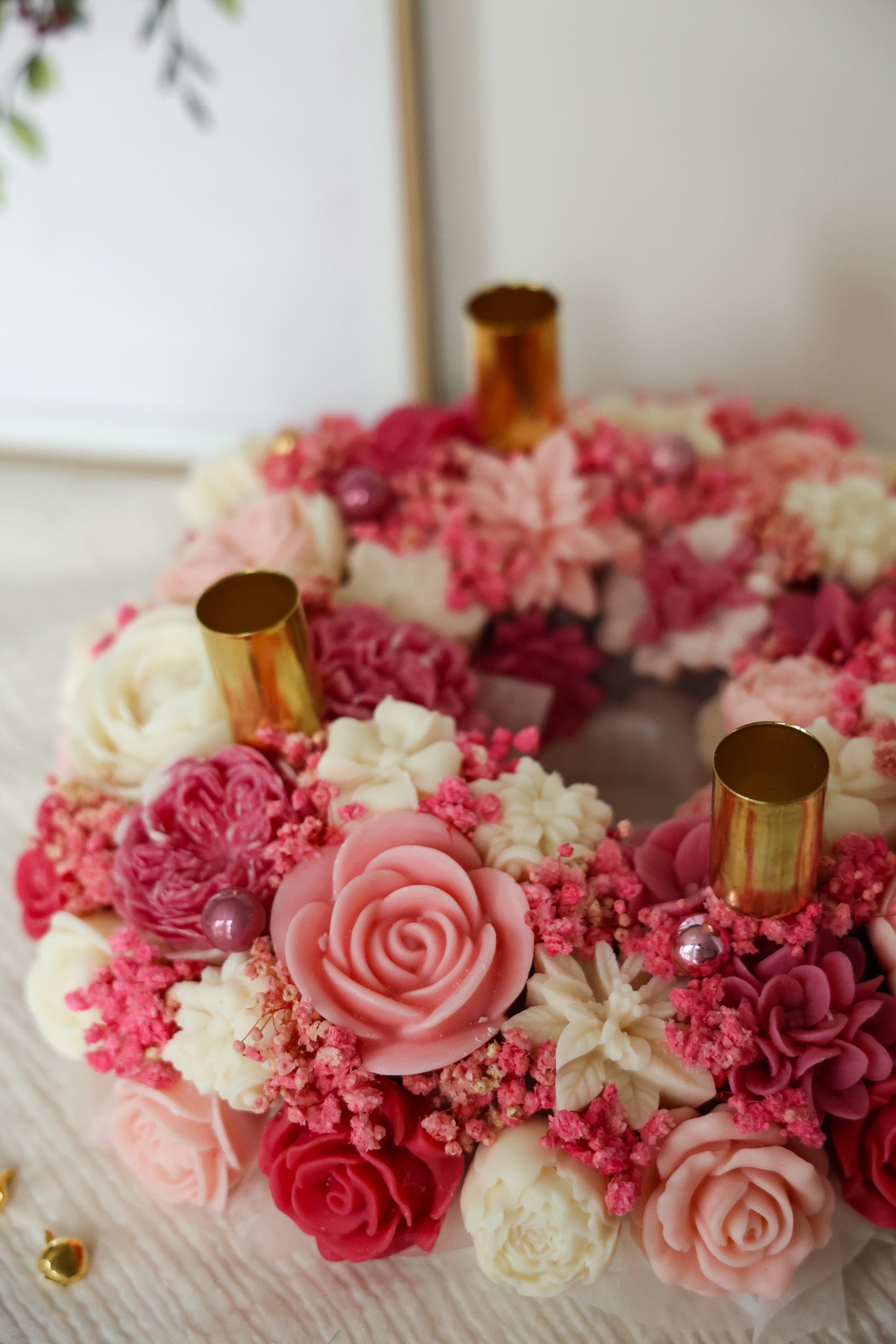 Handgemachter Weihnachtskranz aus Wachsblüten aus Rapswachs. In einer handgemachten Form aus Keramik gesteckt. Durchmesser 25cm