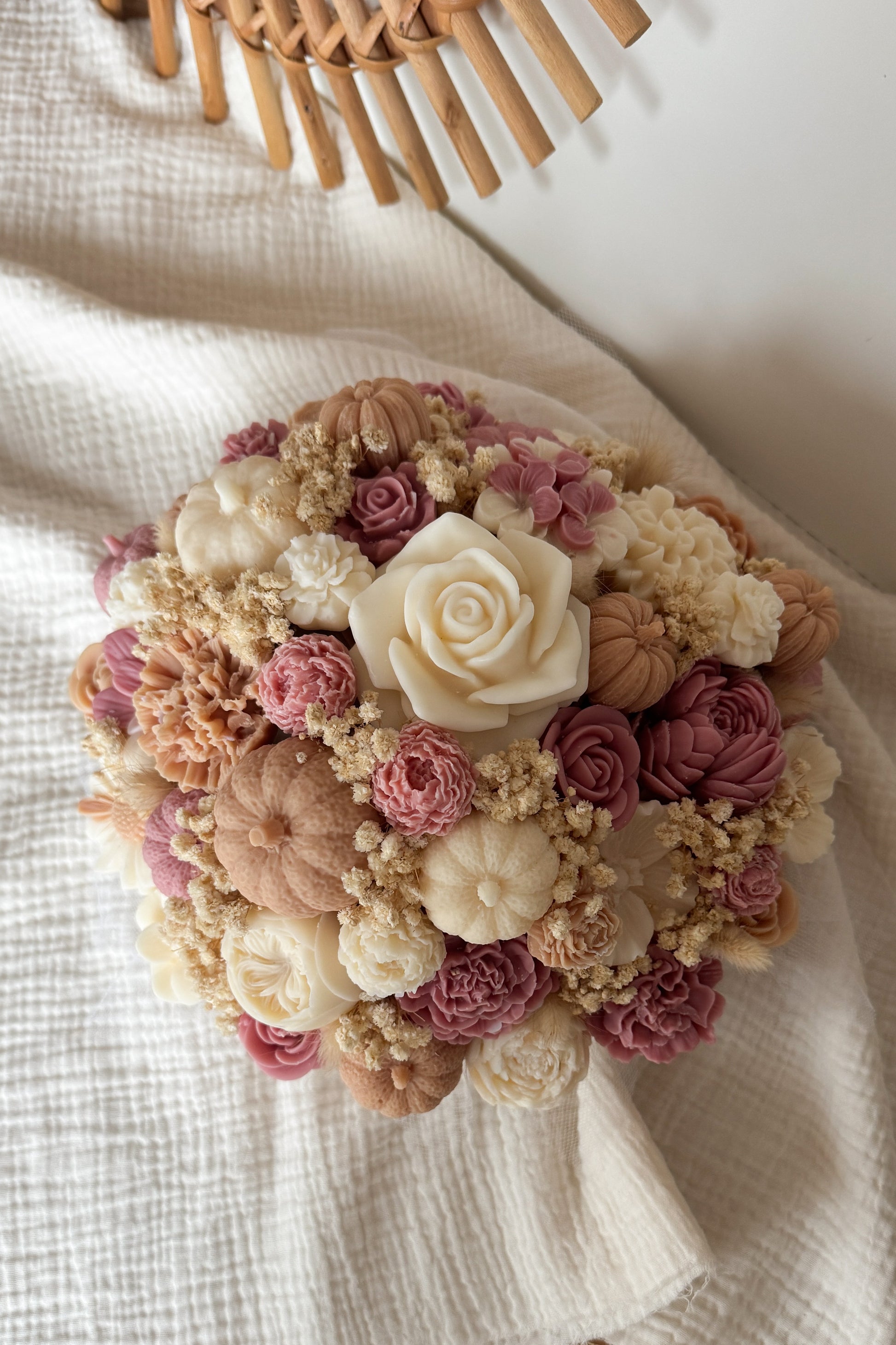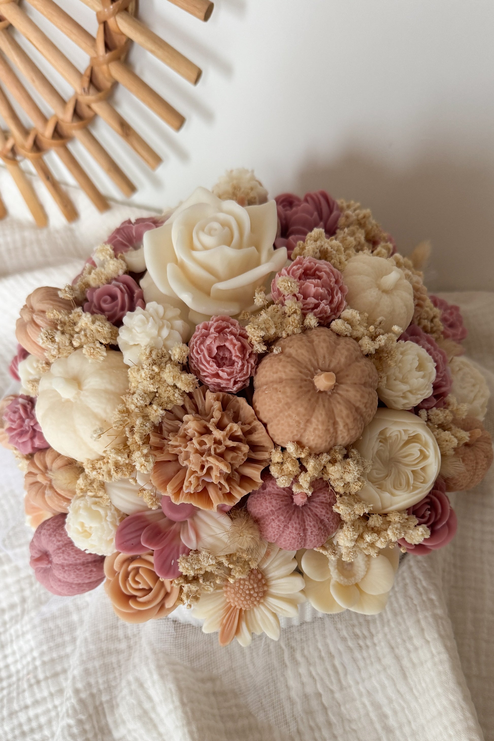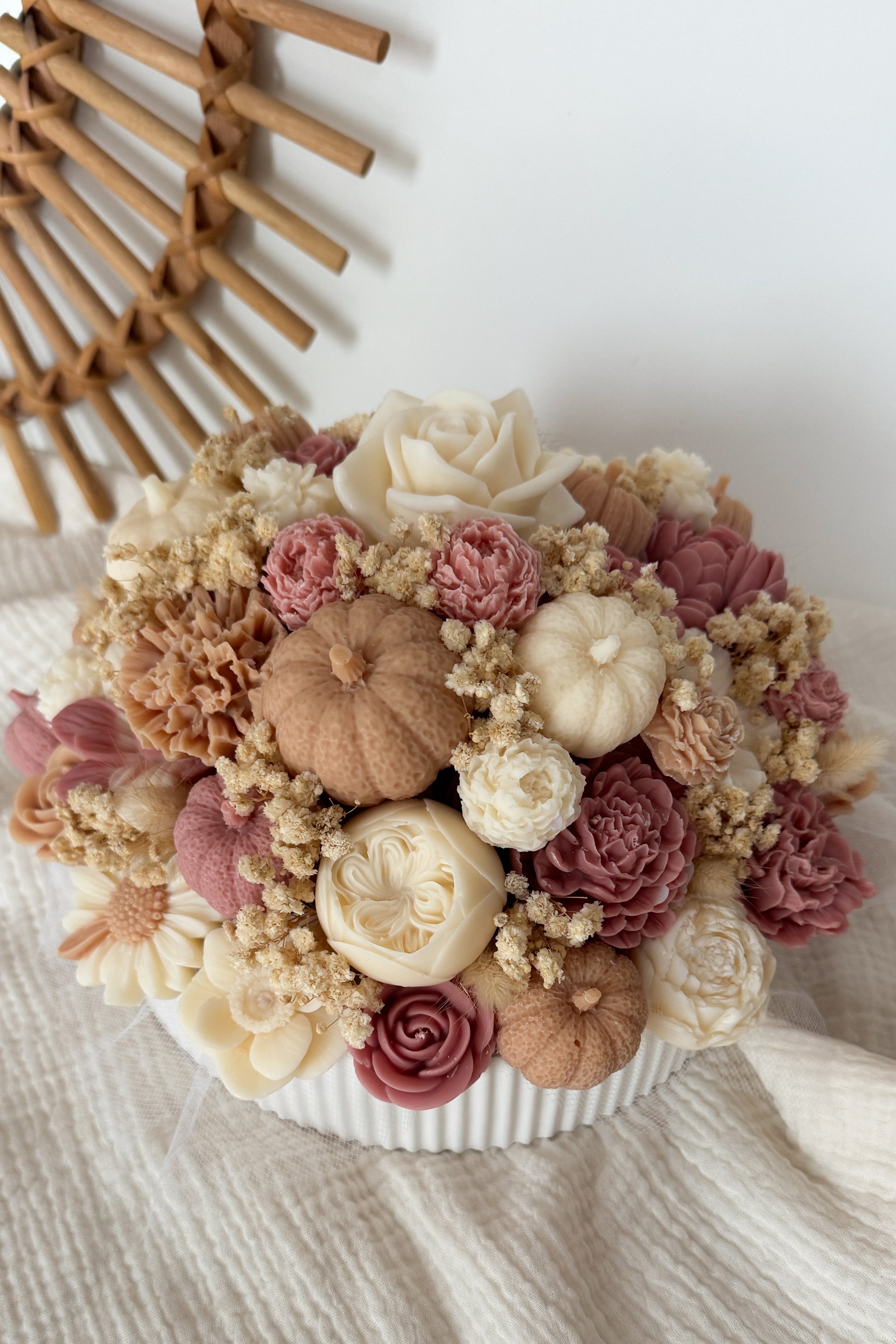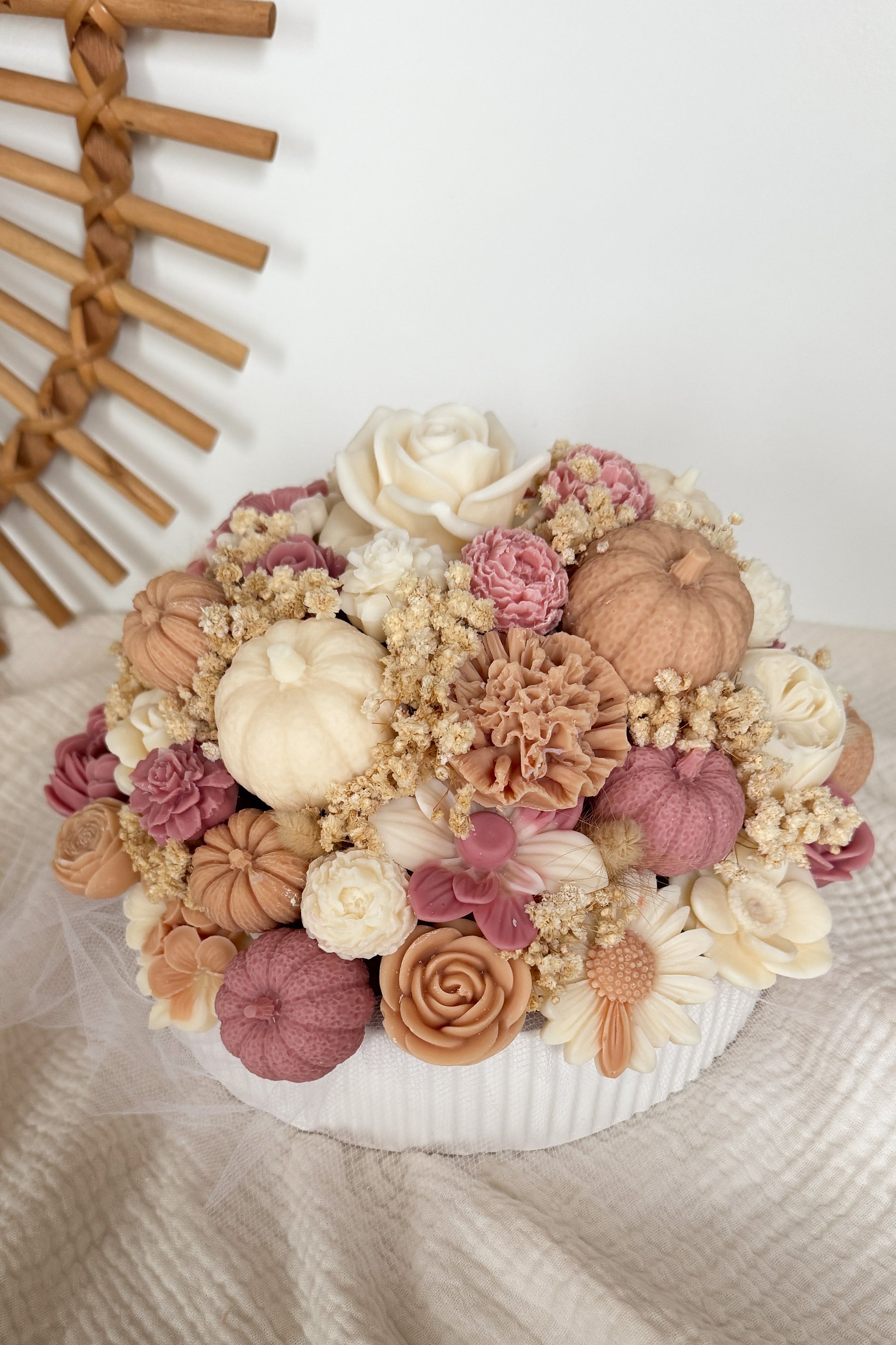 Handgemachter Blumenstrauß aus kleinen Wachsblüten aus Rapswachs. In einer handgemachten Form aus Keramik gesteckt. Durchmesser 25cm