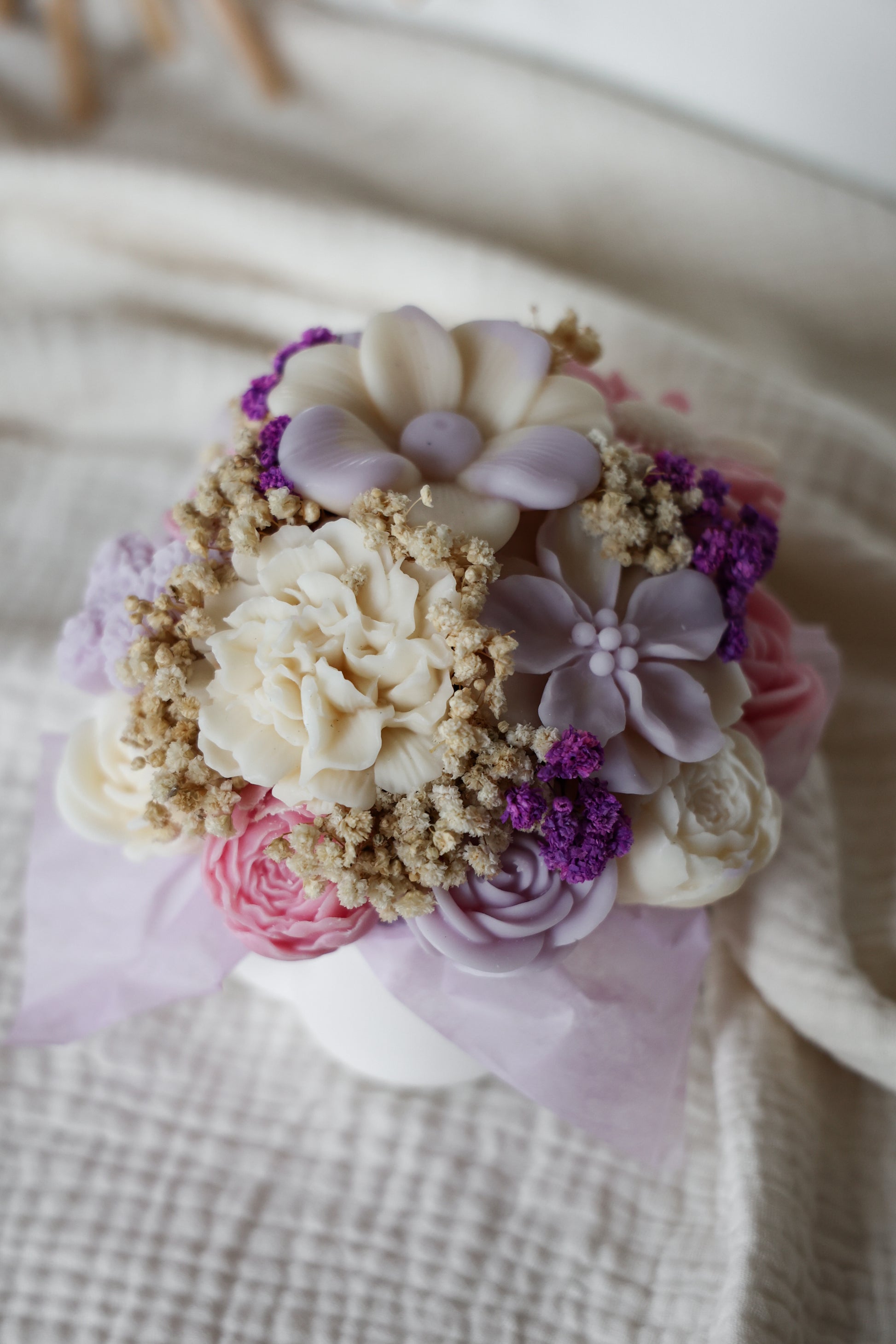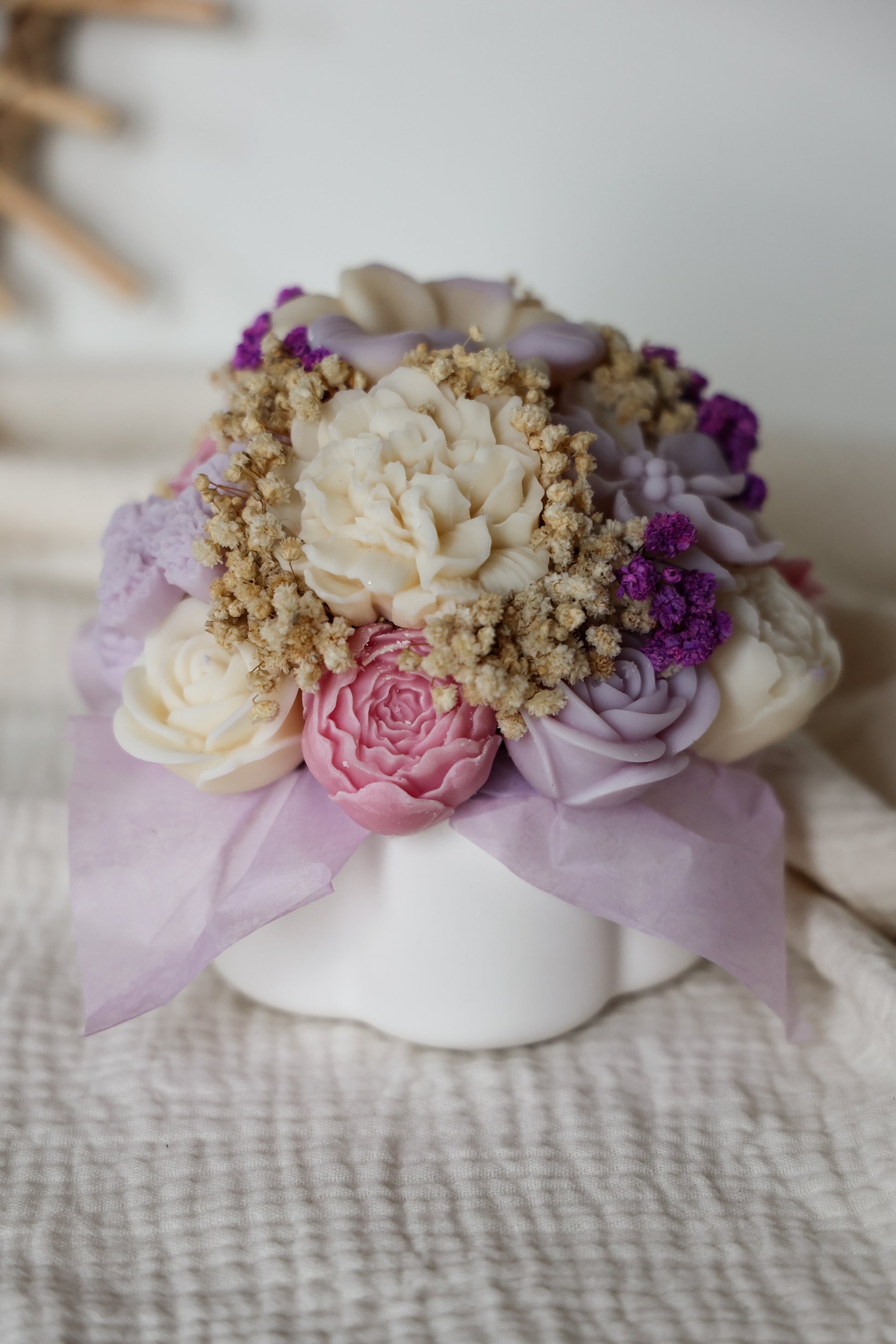 Handgemachtes Blumengesteck aus kleinen Wachsblüten aus Rapswachs in einer handgemachten Form aus Keramik gesteckt.