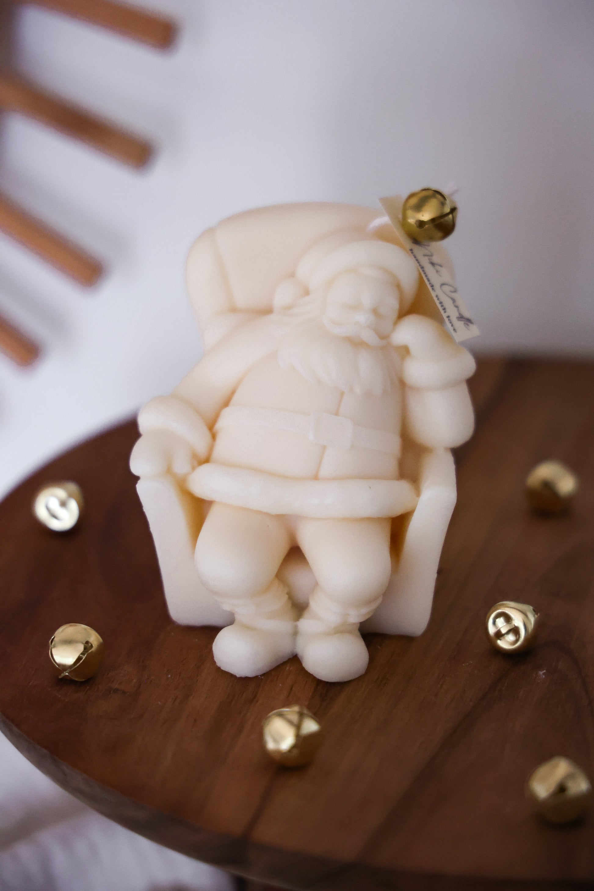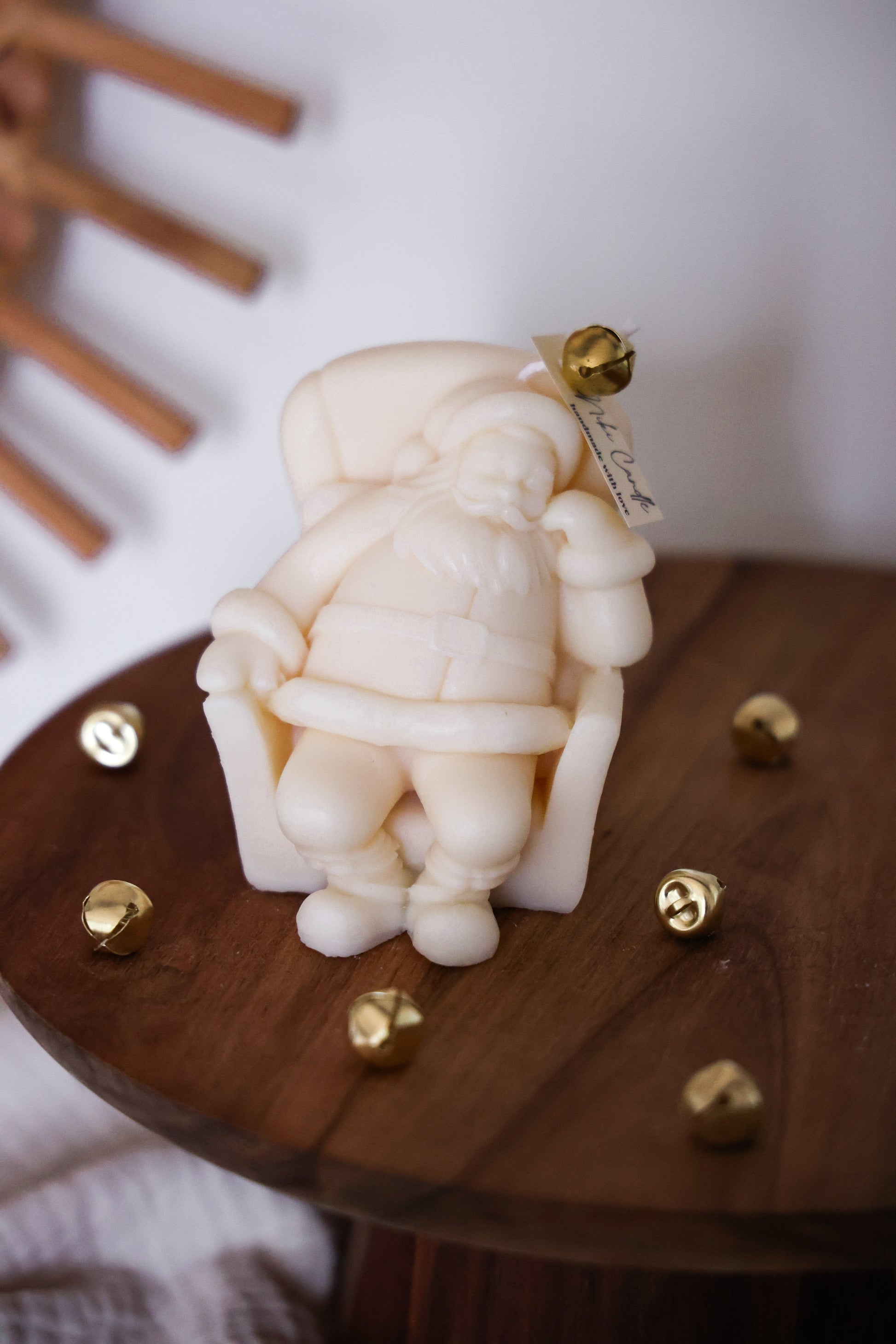 Handgefertigte Weihnachtsmann-im-Sessel-Kerze aus deutschem Rapswachs.